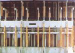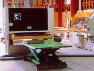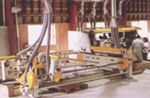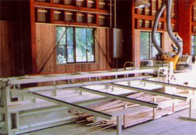 パネルや階段材などの部材を接着します。現在の住宅事情で、パネル工法や2×4に対応するために、フィンガージョイントされた材を水平に圧縮します。 |