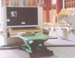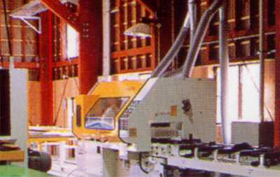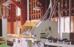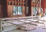 光電式ジャンピングクロスカットソーで欠点を除去された部材の端をフィンガー加工し、接着剤を塗布した後ジョイントして、集成材を生産します。水平式なので、ジョイントされた内装材の表面が滑らかになります。 |